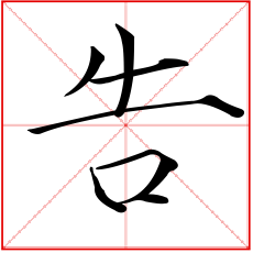 (会意。甲骨文字形,上面的“牛”,牛触人,角着横木,所以告人也。从口,从牛。本义:报告,上报)