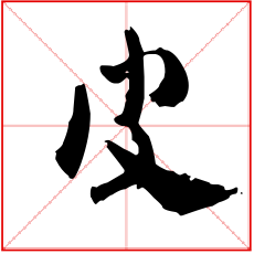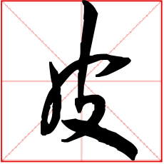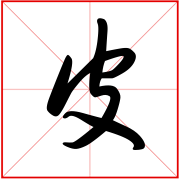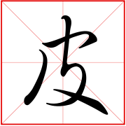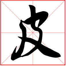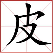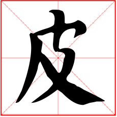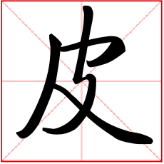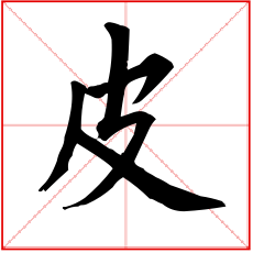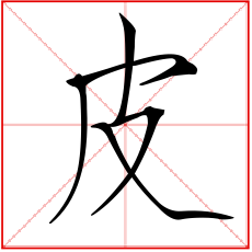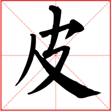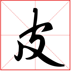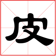 (会意。金文字形上面是个口,表示兽的头;一竖表示身体;右边半圆表示已被揭起的皮;右下表手。“皮”是汉字部首之一。本义:用手剥兽皮)