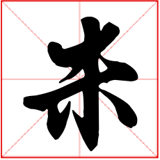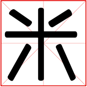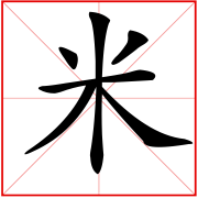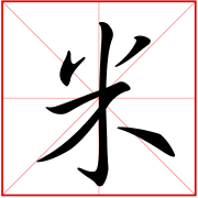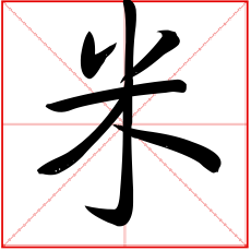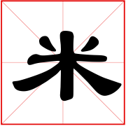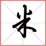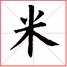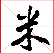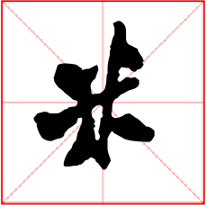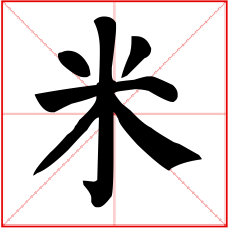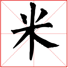 (象形,甲骨文字形。象米粒琐碎纵横之状。“米”是汉字的一个部首,从“米”的字与米、粮有关。本义:谷物和其他植物子实去壳后的子实)