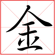 又如:五金(指金、银、铜、铁、锡,泛指金属);白金(铂的通称;古代指银子);金背(镜子);金钥(门销或金属门环、门闩);金荷(金属制成的荷叶状独台);金铺(本指门上衔接门环部分的带有虎头等花纹的装饰物,亦指门环);金钟(金属酒杯)