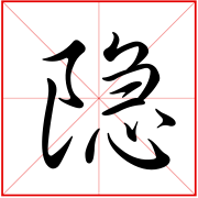 又如:隐占身体(隐藏、掩护自己真实面目);隐遁(隐藏);隐谋(隐密计划);隐秀(隐藏智慧,不露锋芒或才华);隐候(在暗处等待);隐耀(隐藏光辉,隐藏身体。比喻才华不外露);隐身术(古代方士所隐蔽自己身形而使他人不可见的一种法术);隐冒(隐匿冒充);隐翳(掩蔽;遮蔽);隐掩(遮蔽掩护)