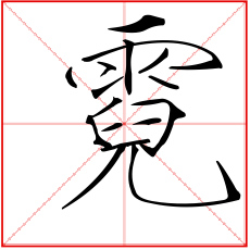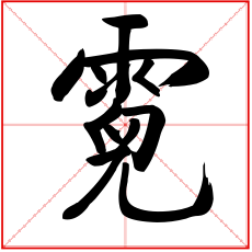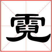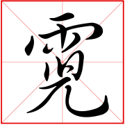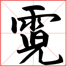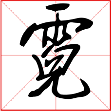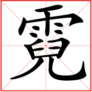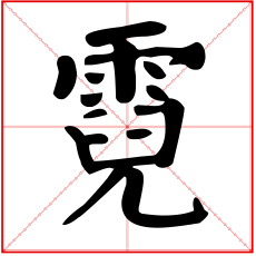 彩云;云霞〖rosyclouds〗。如:霓衣(以霓所制的衣裳。多以形容仙人所穿的服装。也指五彩薄细如虹霓的衣服);霓旄(画有虹霓的旗帜);霓旌(饰以五彩的旗帜。多用于仪仗。因其似霓虹,故名);霓饮(蜺虹汲水);霓裳(用霓制成的霓裳。即霓衣)