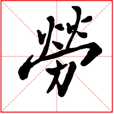 (会意。小篆字形,上面是焱(yàn),即“焰”的本字,表示灯火通明;中间是“冖”字,表示房屋;下面是“力”,表示用力。夜间劳作。本义:努力劳动;使受辛苦)