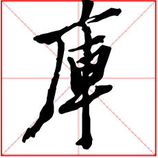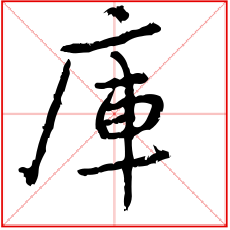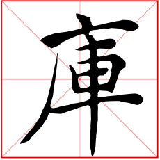 (会意。从广(yǎn),表示与房屋有关,从车。兵车藏在房屋一类的建筑内,表示是储藏武器战车的地方。本义:军械库,收藏兵器和兵车的处所)