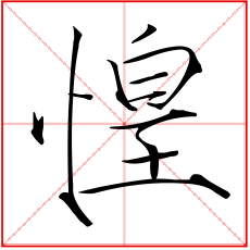 又如:惶惶(惊恐不安);遑迫(惊慌);惶汗(惊惧而汗流);惶沮(恐惧沮丧);惶怖(恐惧害怕)